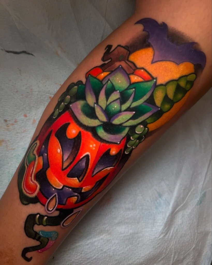 This vibrant tattoo fuses spooky and botanical themes in bold, eye-catching color. A glowing jack-o’-lantern serves as the base, its carved expression lit with rich oranges and reds. Sprouting from the top is a vivid succulent, shaded in purples, greens, and blues for a lush, surreal twist.
