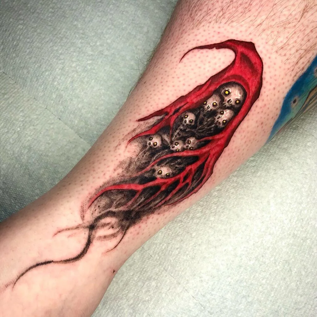This chilling tattoo features a spectral figure cloaked in tattered red, housing a cluster of haunting, wide-eyed faces with glowing yellow pupils. The dark smoke-like tendrils trailing from the ghostly form suggest it’s rising from—or dragging—souls into the abyss.