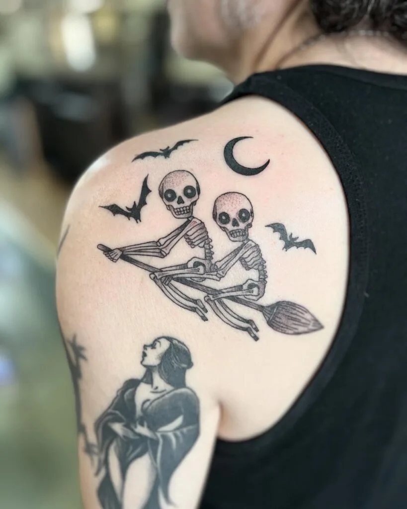 This playful and spooky tattoo features two skeletons riding together on a broomstick, soaring through the night sky. Surrounded by bats and a crescent moon, the scene blends Halloween magic with a gothic sense of romance.