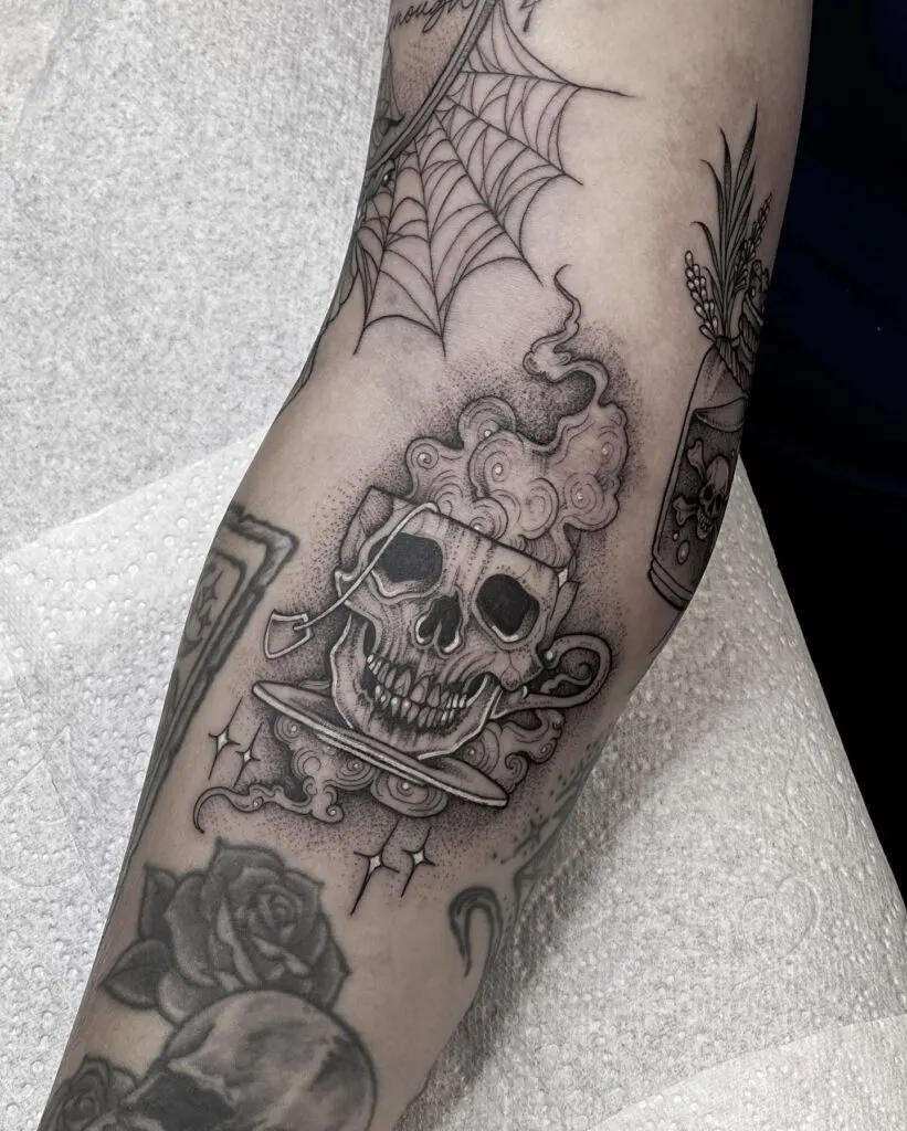 This black and grey tattoo blends gothic elegance with eerie charm, featuring a detailed skull resting inside a teacup. Curling smoke rises from the cup, giving the skull a ghostly aura, while a tiny spoon rests at the edge, adding a surreal twist.