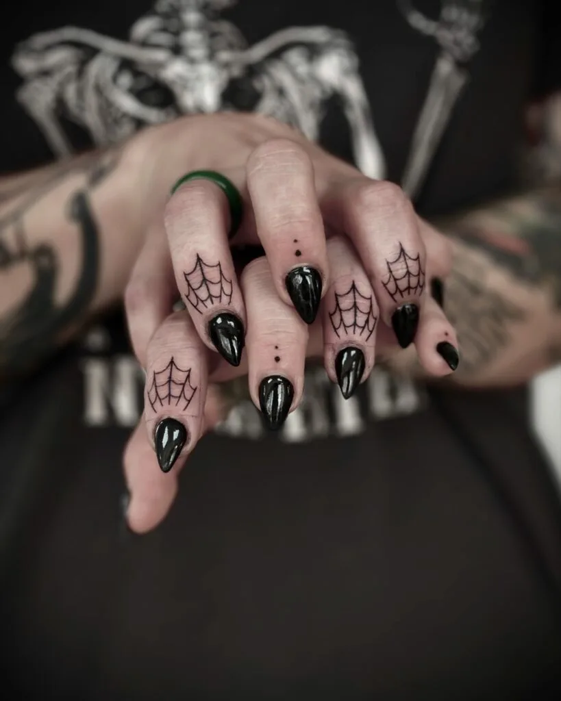 The web designs are clean and subtle, making them a spooky yet stylish choice for fans of gothic or Halloween-inspired looks. Whether worn for the season or year-round, this combination of tiny tattoos and dramatic nails offers a bold, edgy vibe with a touch of dark elegance.