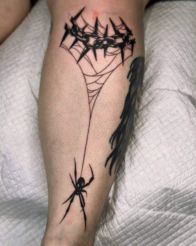 This striking tattoo features a bold black spider dangling from a delicate web that connects to a dramatic chain wrapped in sharp, spiked webs. The design stretches from the lower leg upward, blending realism with gothic edge.