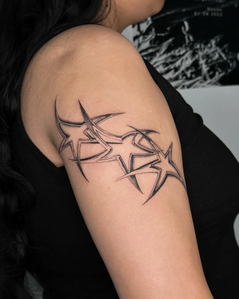 This stunning upper-arm tattoo features a trio of stylized starbursts intertwined with intricate filigree details. The sharp, elongated rays stretch gracefully across the skin, creating a sense of elegant movement and symmetry.