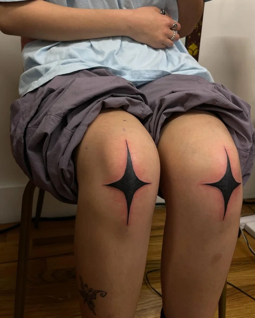 This eye-catching tattoo features matching black starbursts placed symmetrically on each knee. The design’s clean, sharp lines radiate from a narrow center, creating a striking contrast against the skin.