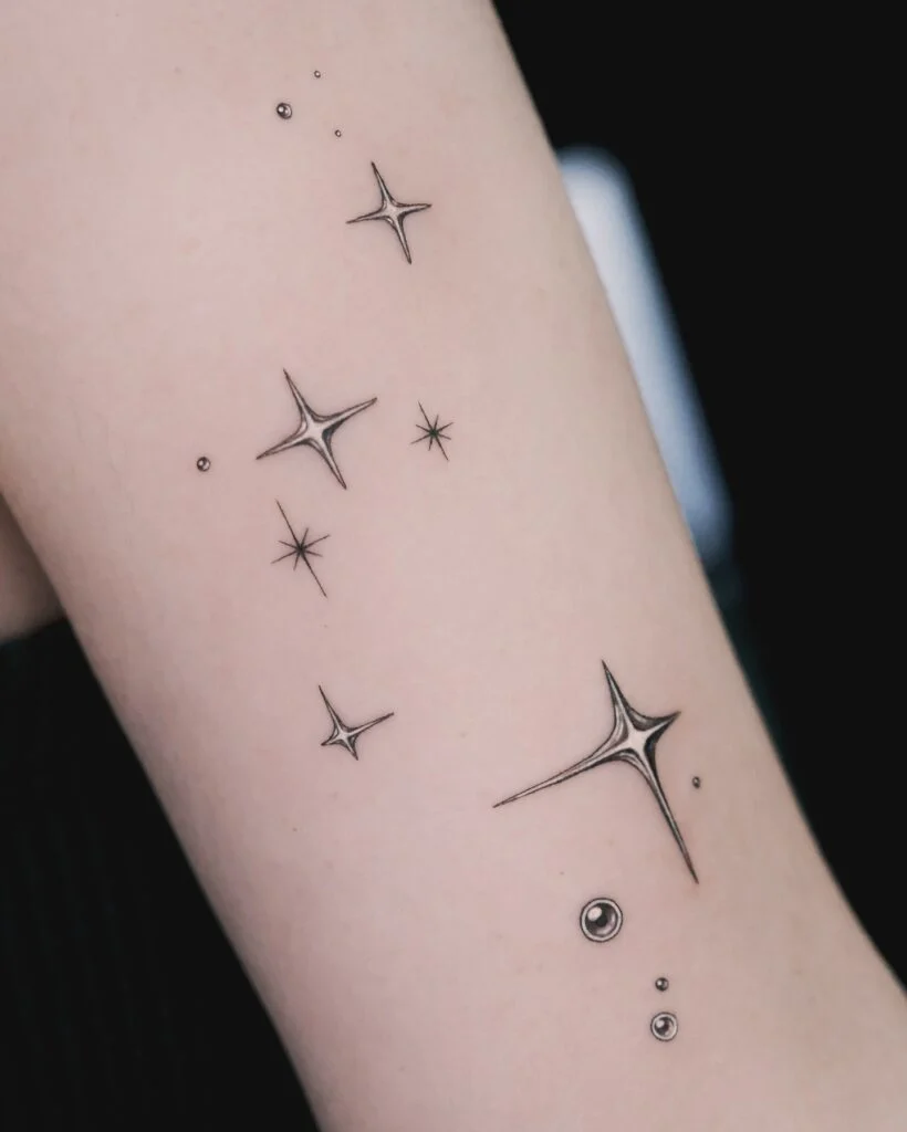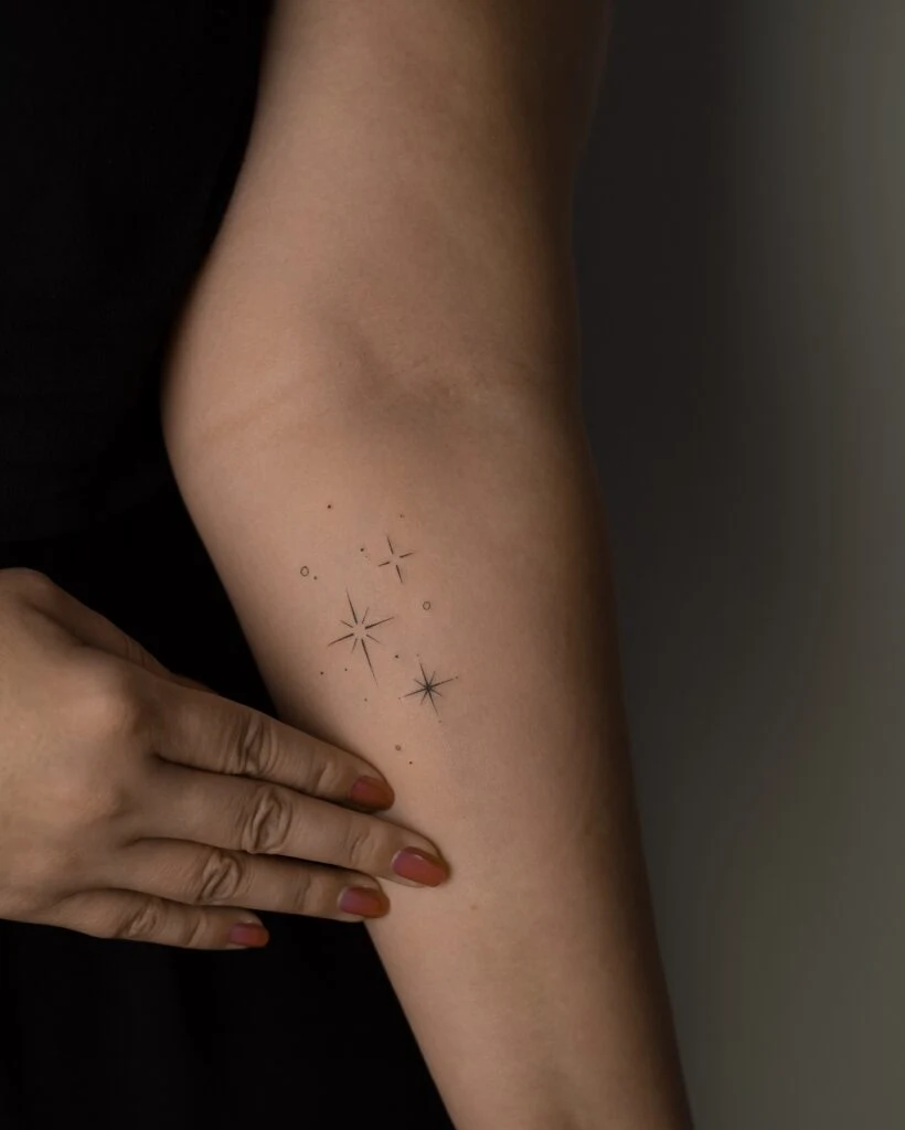 This delicate star cluster tattoo is all about understated beauty. Placed gently along the inner arm, tiny stars and fine-line circles dance together, creating a subtle constellation effect.