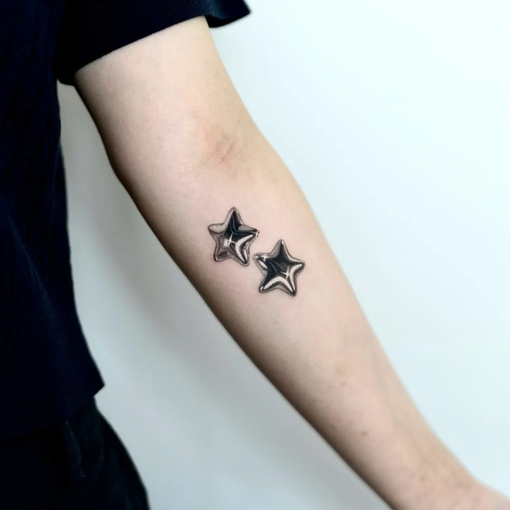 This eye-catching tattoo features two chrome-style stars with a hyper-realistic metallic shine. The bold contrast between dark inner tones and bright highlights creates a glossy, 3D appearance that looks almost like the stars could pop off the skin.