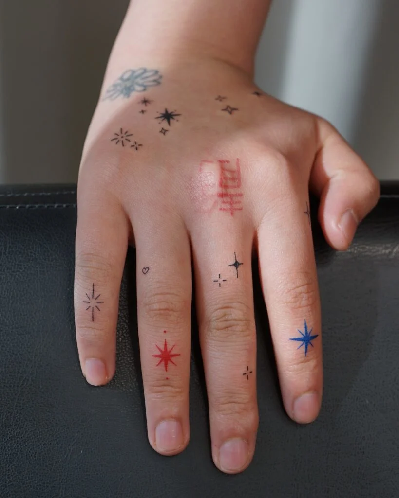 This playful star tattoo design features tiny celestial shapes scattered across the fingers and hand. The mix of fine-line black stars with vibrant pops of blue and red creates a charming contrast and a sense of cosmic energy.
