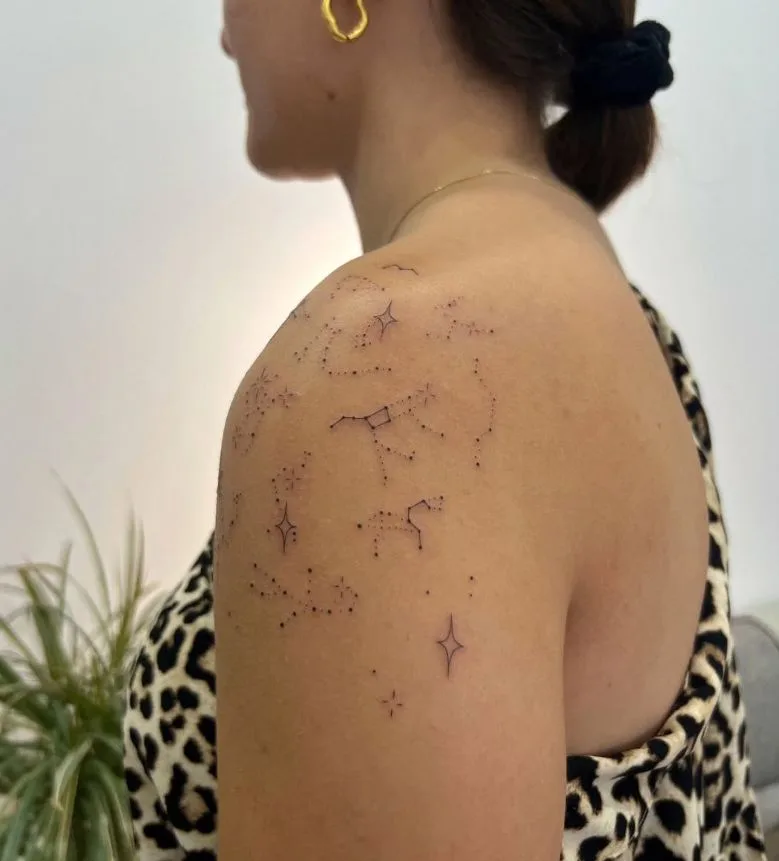 This delicate shoulder tattoo features a beautifully scattered map of tiny stars and fine-line constellations. The intricate dotted patterns and subtle star shapes stretch across the upper arm and shoulder, mimicking a miniature galaxy.