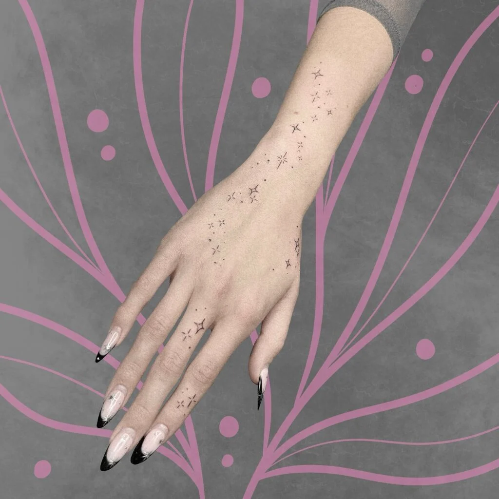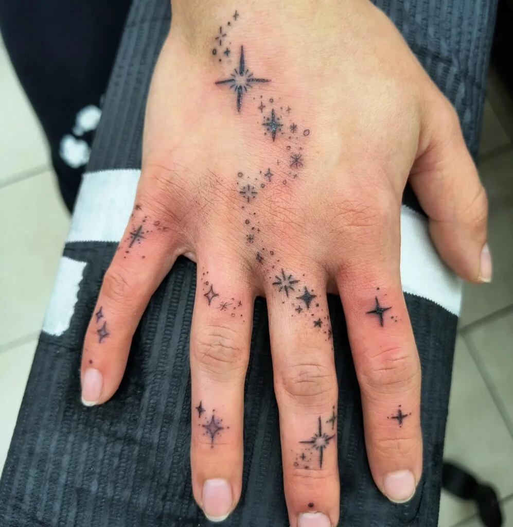 This intricate tattoo features a scattering of tiny stars and shimmering starbursts that dance across the fingers and the back of the hand. The design blends fine dots and delicate shapes with a few bold starbursts, creating a radiant, cosmic trail.
