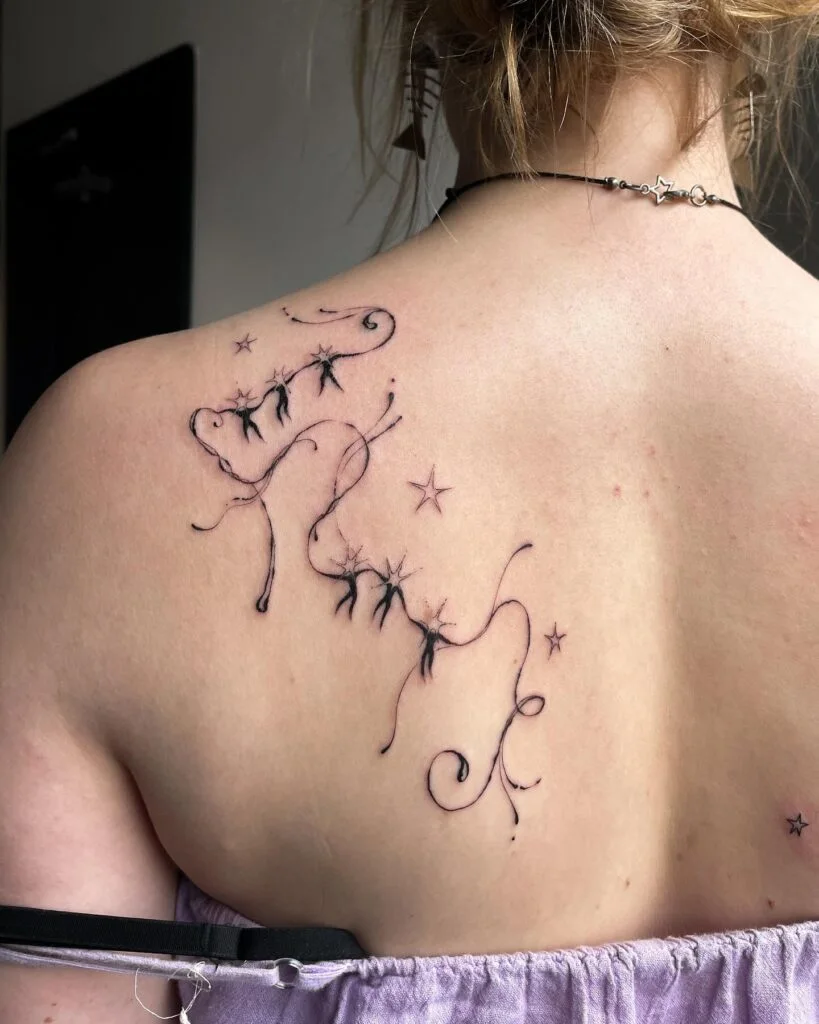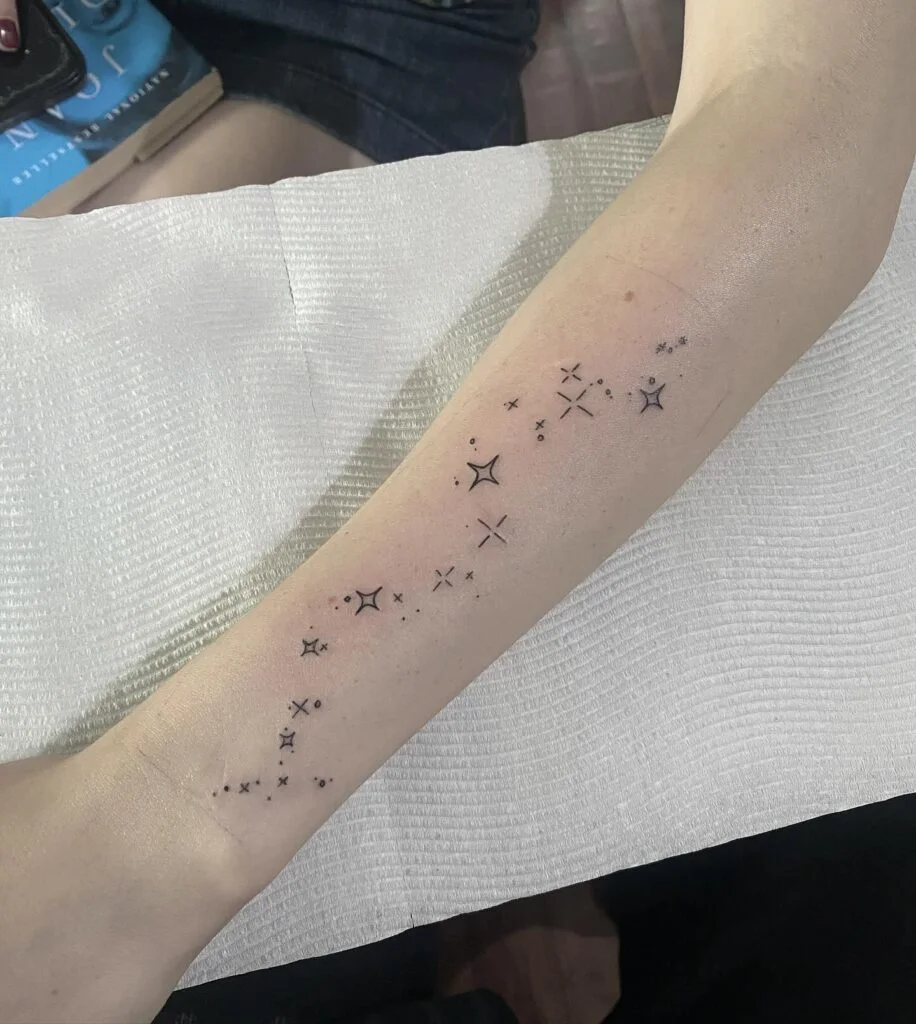 The design feels light and airy, with each small star seeming to shimmer on its own. It’s perfect for those looking for a gentle, magical tattoo that reflects a sense of wonder, freedom, and the beauty of the night sky.