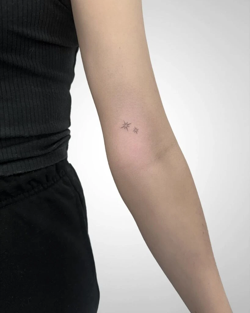 This graceful tattoo features two minimalist stars inked with fine, crisp lines just above the elbow. Placed close together but different in size, they evoke a subtle sense of balance and harmony.