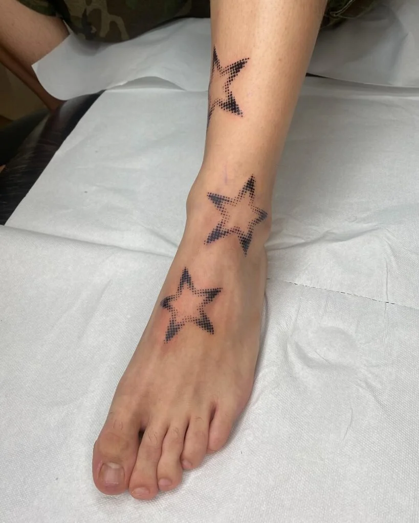 The subtle fading dots around the edges soften the bold shapes, making this tattoo feel both strong and ethereal. Its placement on the ankle and foot allows the stars to flow with the body’s natural curves, creating a visually dynamic and eye-catching tattoo.