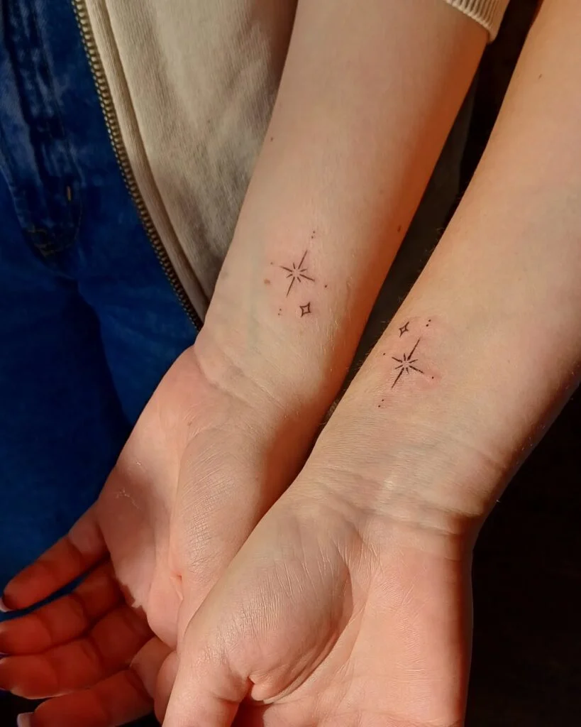 This pair of matching tattoos features delicate starbursts placed on the inner wrist, creating a subtle and personal connection. Each design is minimal, with fine lines and tiny accent dots that give a sense of light and twinkle.