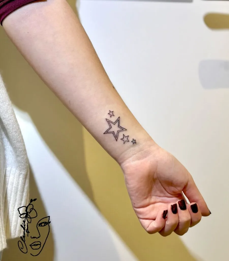 This delicate star tattoo features a playful mix of outlined stars and tiny sparkling shapes scattered across the wrist. The design feels light and graceful, with different sizes and bold outlines creating a sense of movement and depth.