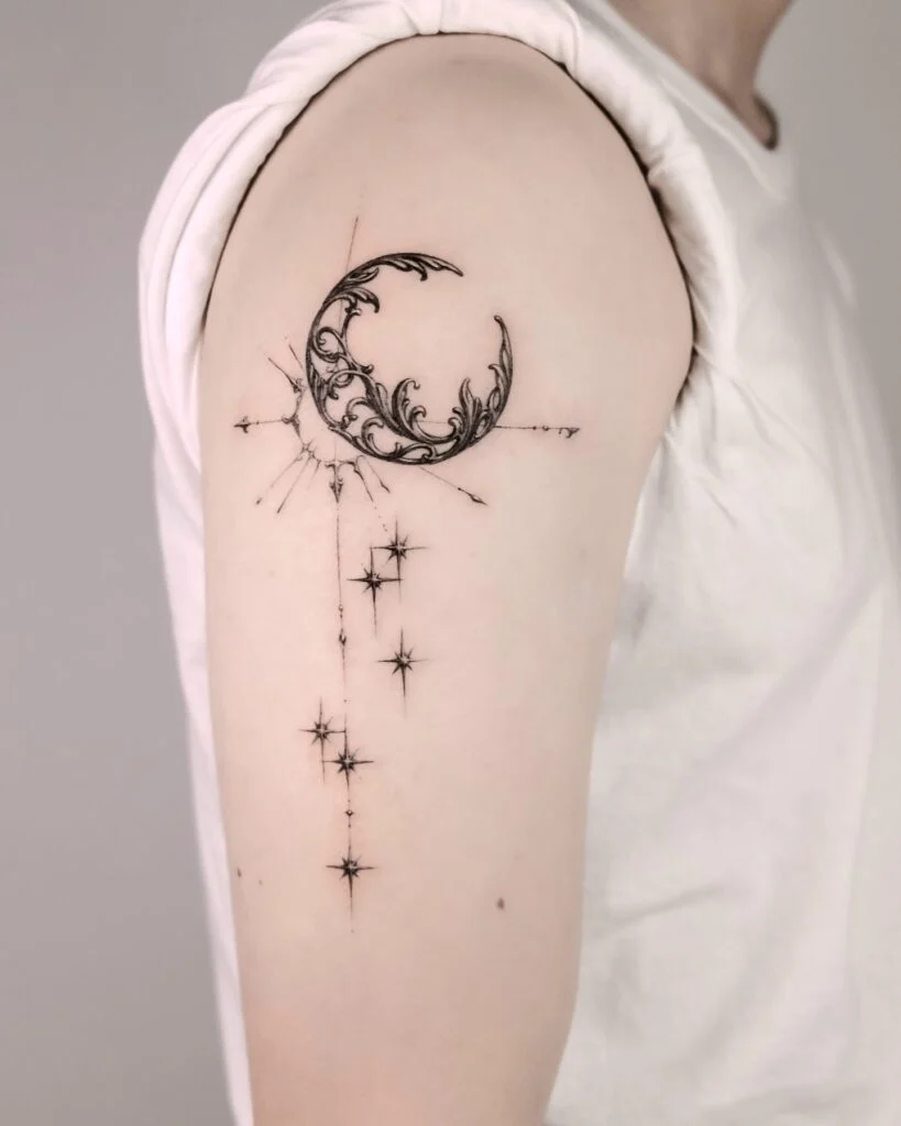 Perfect for those who appreciate understated designs, this tattoo follows the natural contour of the shoulder, making it a simple yet captivating choice. Its light and refined lines make it a timeless piece for anyone who loves minimalist ink with a touch of cosmic charm.