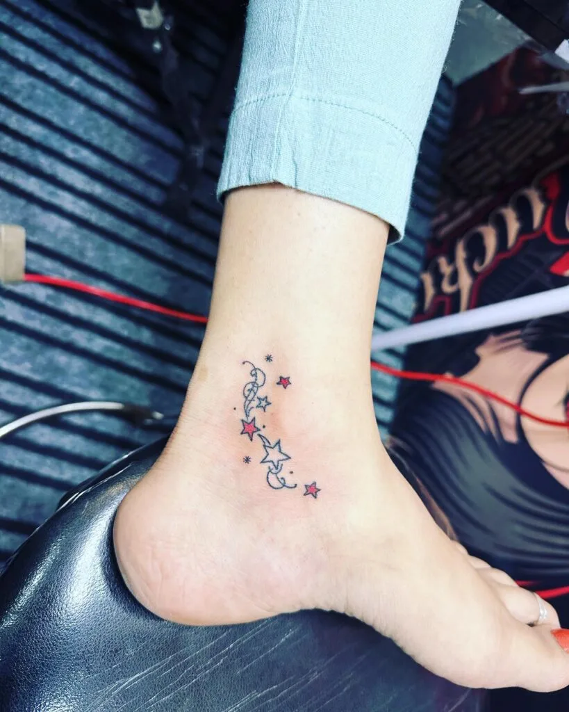 The stars, arranged in an imperfect trail, give a feeling of movement and magic. Placed just above the ankle, this design blends cuteness with quiet inspiration, making it a perfect choice for someone who wants a subtle but meaningful reminder to always pursue what lights up their world.