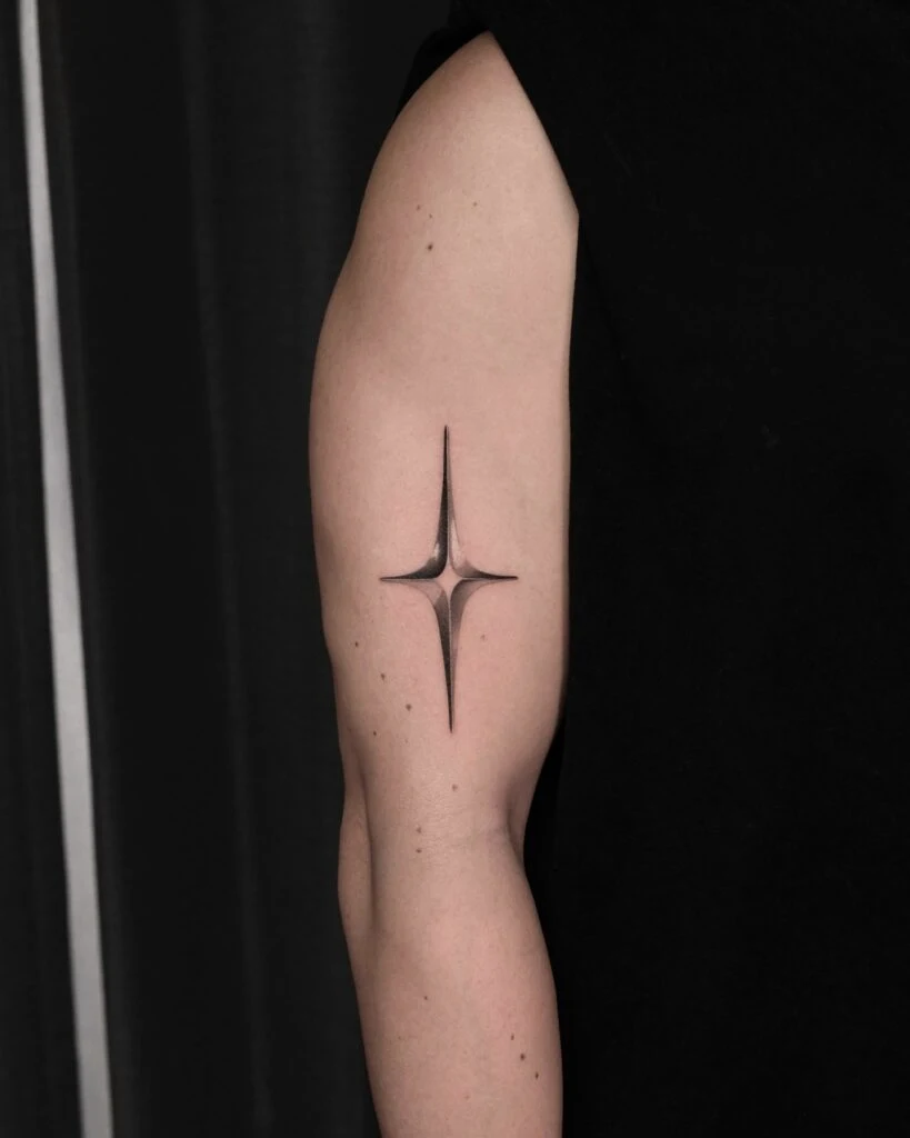 This minimalist arm tattoo features a sharp, elongated starburst with smooth shading that gives it a subtle gradient effect. Placed vertically along the triceps, its clean edges and soft inner glow create a modern, metallic look.