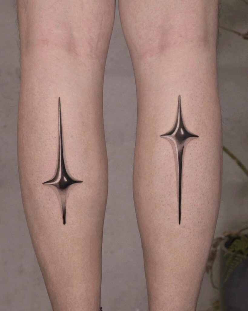 This symmetrical calf tattoo set features a pair of bold, sleek starbursts rendered in smooth gradients of black and gray. The elongated shapes stretch vertically along the calves, creating a powerful sense of motion and balance.