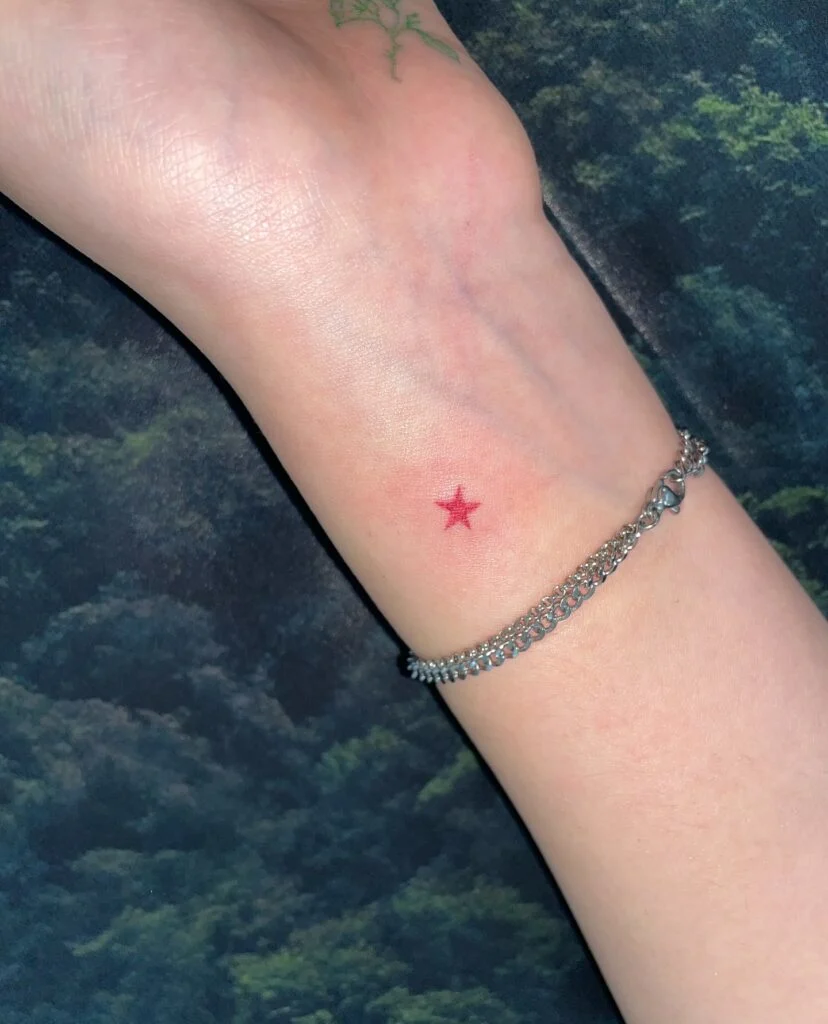 This delicate tattoo features a small, bright red star placed subtly on the wrist. Its minimalist design and vibrant color make it a perfect choice for someone who loves simple yet meaningful ink.