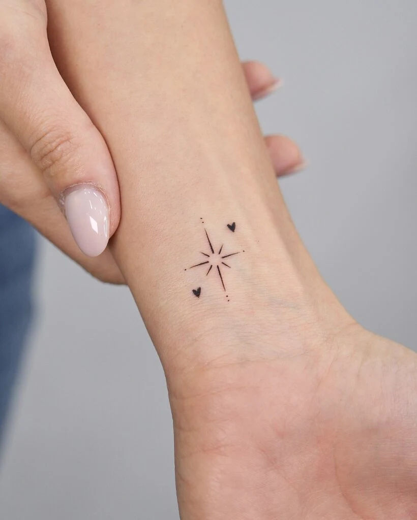 This delicate tattoo features a small starburst surrounded by two tiny hearts on the inner wrist. The design’s fine, minimalist lines and subtle dot details give it a gentle, graceful appearance.