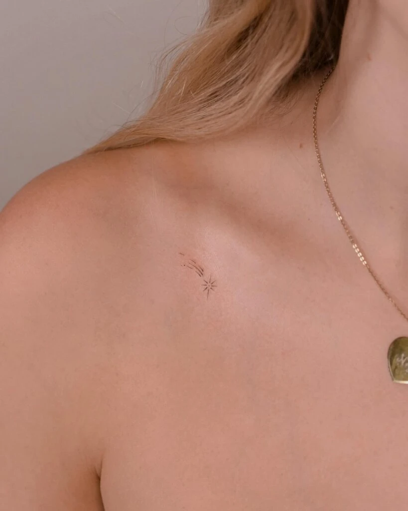 This minimalist tattoo features a delicate shooting star placed gracefully along the collarbone. The star is surrounded by a few fine, dotted trails to create a gentle, stardust effect that feels subtle and ethereal.
