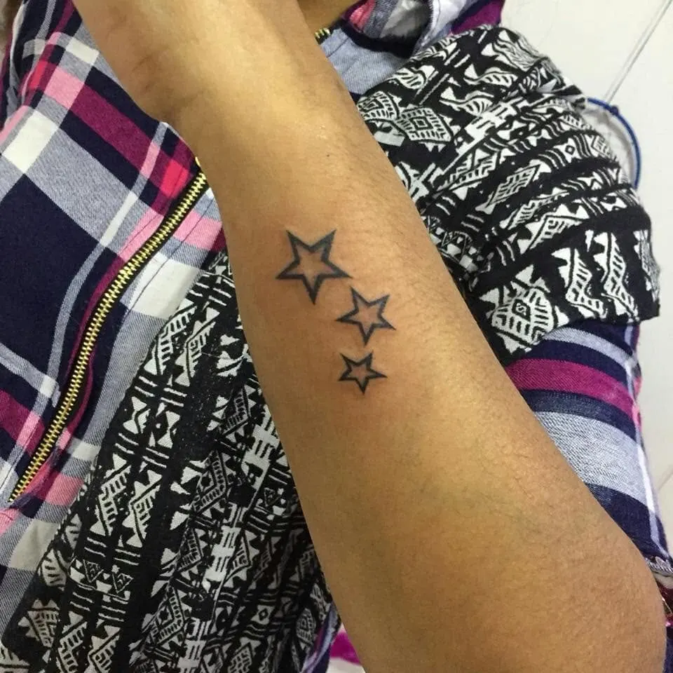 This simple yet striking tattoo features three outlined stars of different sizes arranged in a cascading pattern along the forearm.