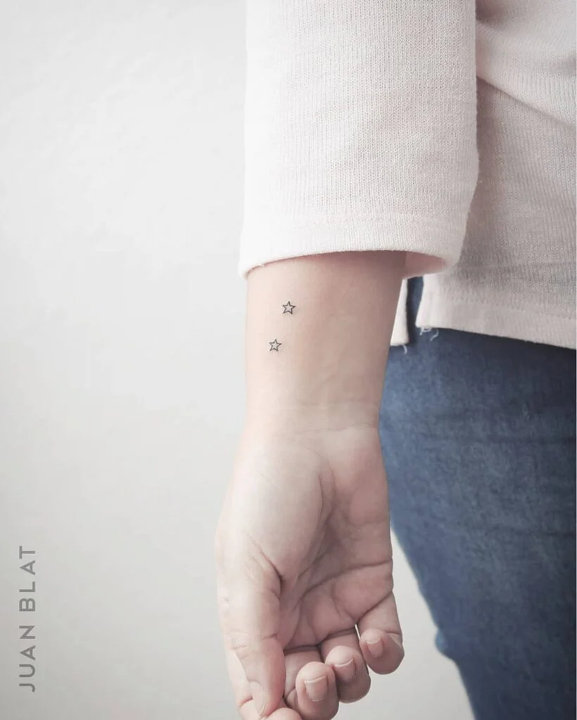 This delicate tattoo features two tiny outlined stars placed subtly on the inner wrist. The minimalist style, with its simple black lines and small size, makes it a graceful, almost hidden detail.