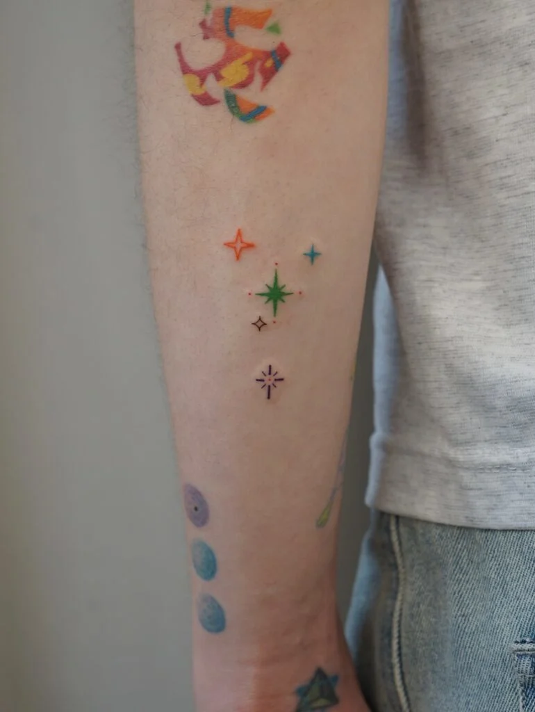 This colorful tattoo features a small cluster of minimalist starbursts arranged vertically along the forearm. Each star is inked in a different vibrant hue — orange, green, blue, purple, and black — creating a lively, playful energy.