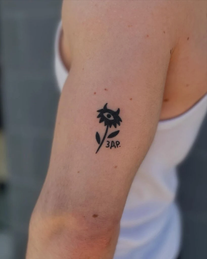 This bold stick and poke tattoo features a solid black flower with an eye at its center, giving it a surreal, symbolic twist. The stylized petals and leaves contrast with the crisp lines of the Cyrillic letters “ЗДР” underneath, possibly hinting at a personal message or cultural nod.