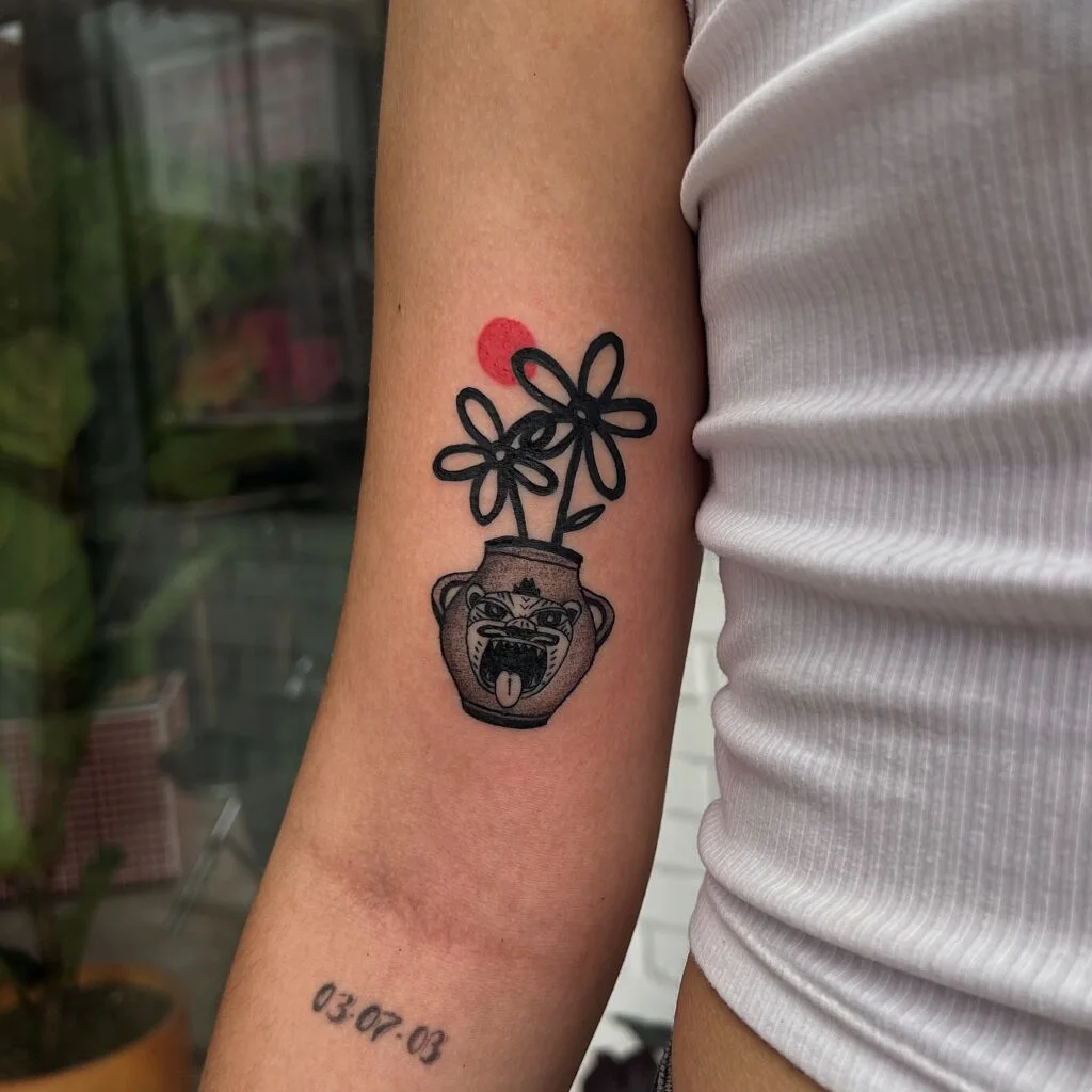 Angry Vase with Flowers Stick and Poke Tattoo