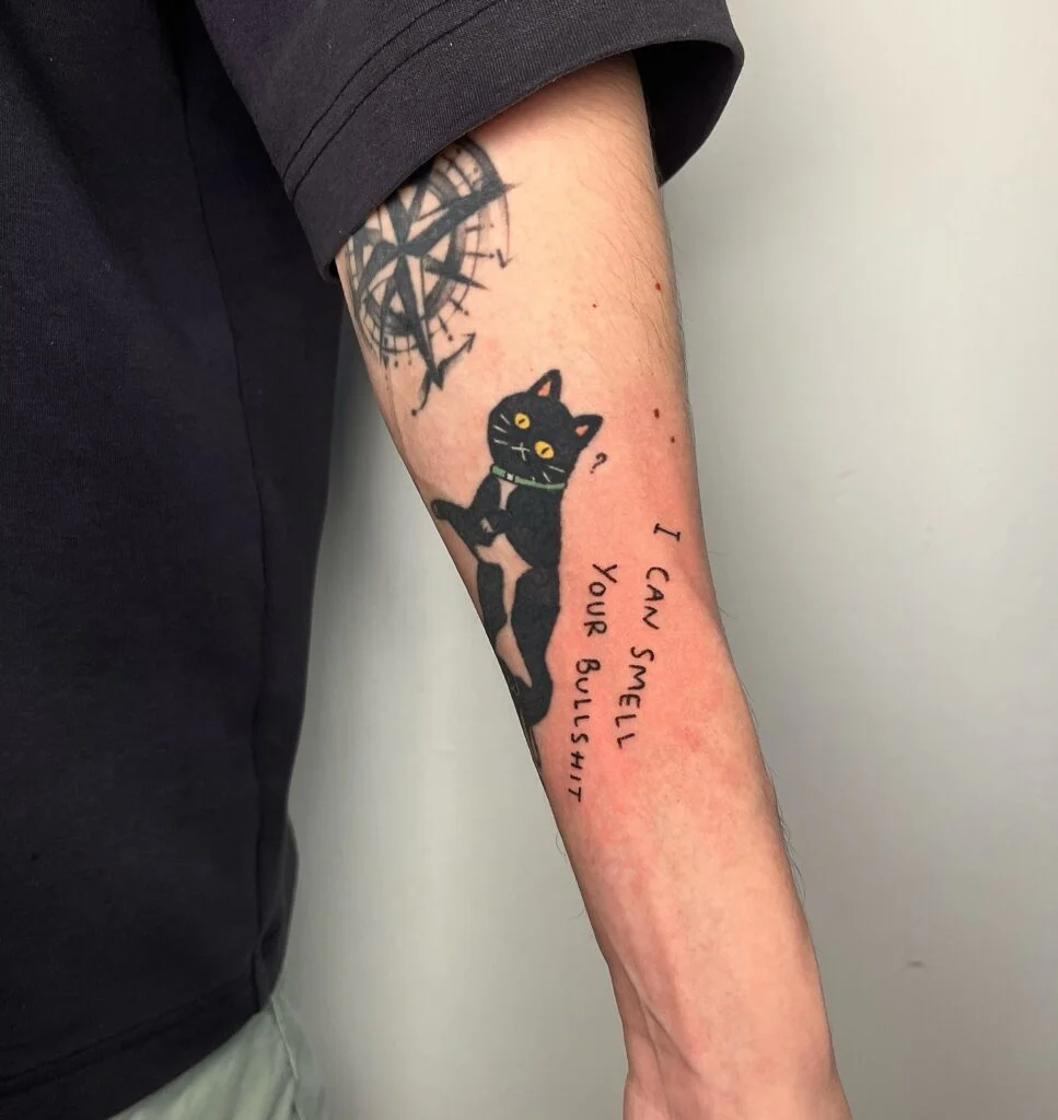 This humorous forearm tattoo features a bold black cat standing upright with a piercing gaze and a green collar, paired with the phrase “I CAN SMELL YOUR BULLSHIT” written beside it.
