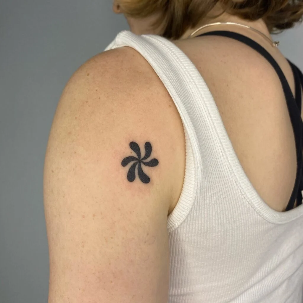 This striking stick and poke tattoo features a bold black swirl composed of six rounded arms, forming a clean, spiral flower-like shape. Its perfect symmetry and thick lines give it a strong graphic presence, while the placement on the upper arm adds to its impact.