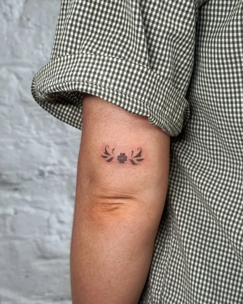 Placed neatly on the back of the arm, it combines traditional floral elements with modern simplicity. The central flower could symbolize growth, beauty, or personal transformation, while the mirrored design adds a sense of harmony and structure. With its clean lines and handmade feel, this tattoo is ideal for those drawn to nature-inspired symbols with a balanced and meaningful design.