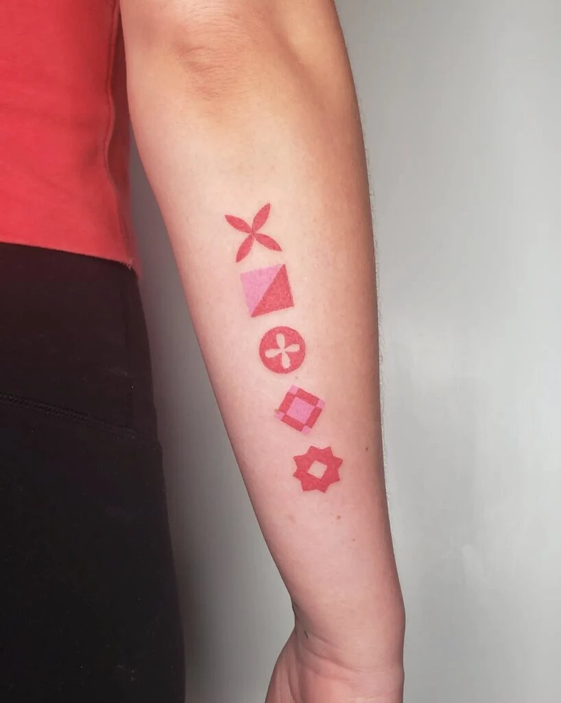 This vibrant forearm tattoo features a vertical arrangement of five abstract geometric shapes, all rendered in striking shades of red and pink. Each symbol is distinct—ranging from floral motifs to angular star-like patterns—giving the piece a playful yet modern aesthetic.