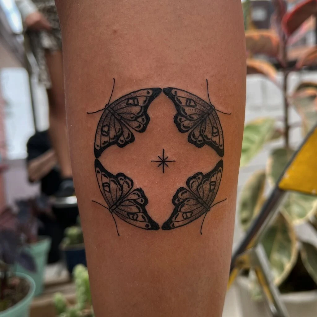 This beautifully symmetrical stick and poke tattoo features four butterflies arranged in a circular formation, their wings overlapping to form a soft, unified shape. At the center sits a small eight-pointed star, anchoring the design with a subtle cosmic touch.