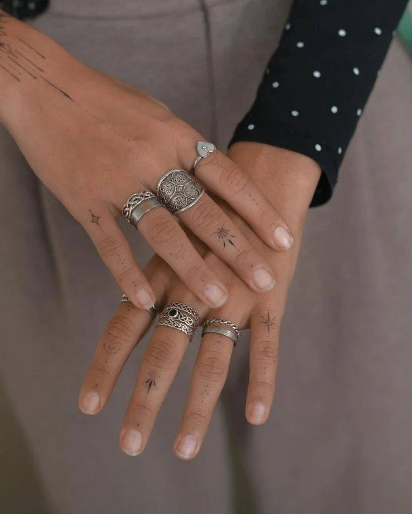 Each symbol feels intentional—whether representing light, direction, or connection—and pairs beautifully with manicured nails and stacked rings. These tattoos offer a subtle yet meaningful way to personalize the hands, blending cosmic, geometric, and decorative elements into a refined set that’s both stylish and spiritual in expression.