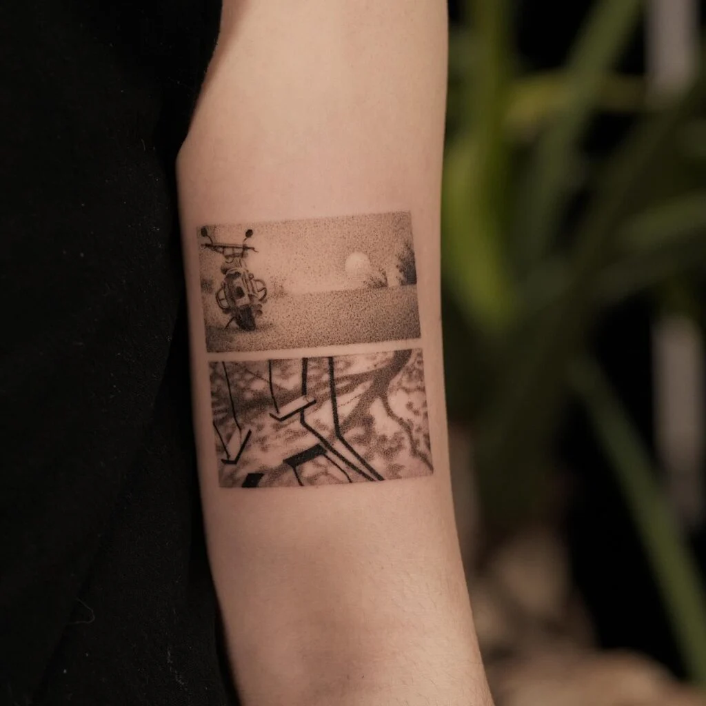 This nostalgic stick and poke tattoo is split into two cinematic panels, each evoking a powerful sense of memory and emotion. The top scene features a motorbike facing a quiet, sunlit road—captured with soft dotwork that mimics the haze of distant recollection.