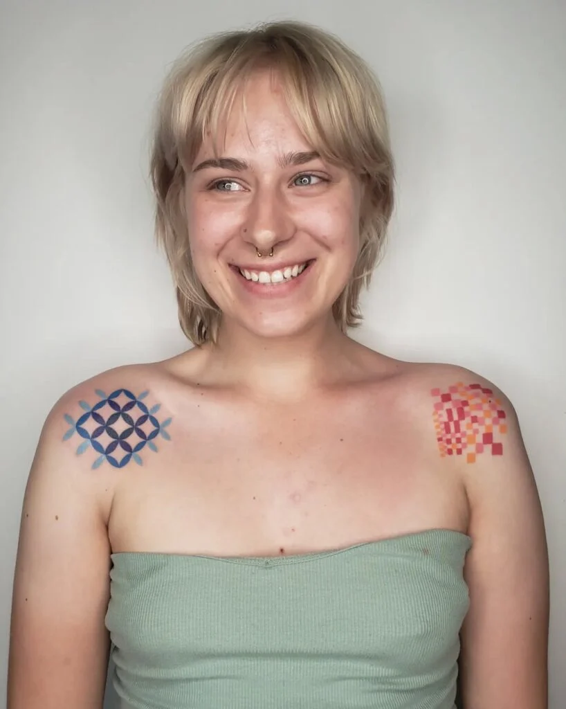 This bold pair of stick and poke tattoos features vibrant, geometric designs on each shoulder, creating a striking visual balance. On the left, overlapping blue petal-like shapes form a symmetrical pattern reminiscent of sacred geometry.