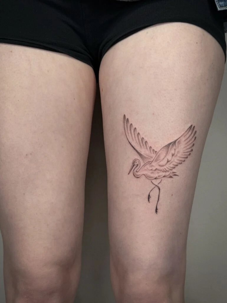 This beautifully crafted stick and poke tattoo shows a graceful crane mid-flight on the upper thigh. With outstretched wings and detailed feather linework, the design captures a moment of serene movement.