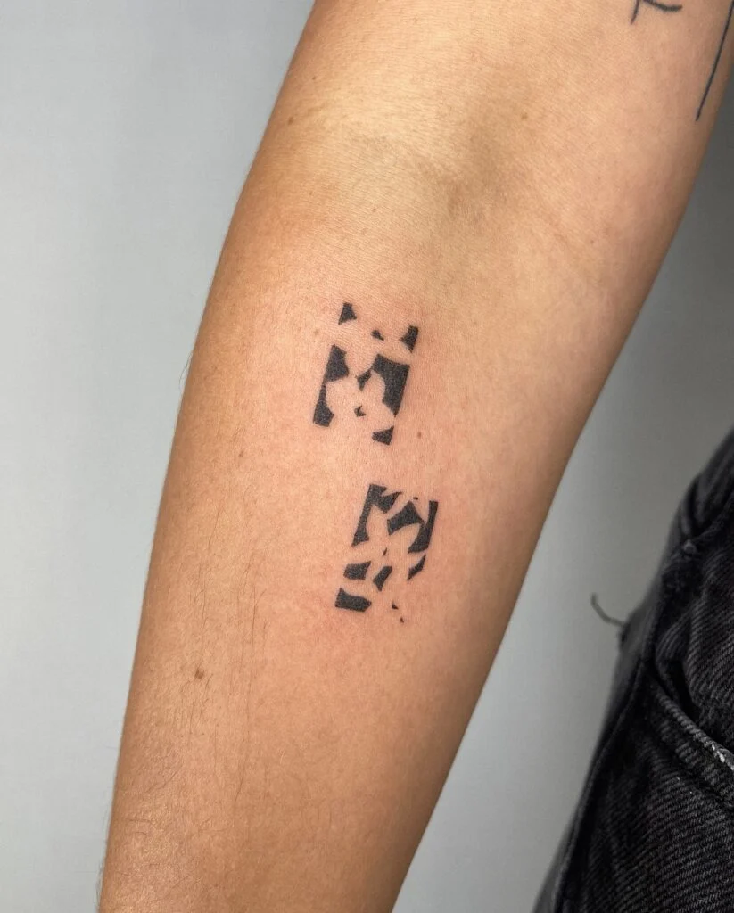 This abstract stick and poke tattoo features two stacked rectangular designs made up of broken black shapes, resembling digital glitches or motion blur. The deliberate distortion within the clean frames creates a sense of visual disruption—inviting the viewer to pause and interpret.