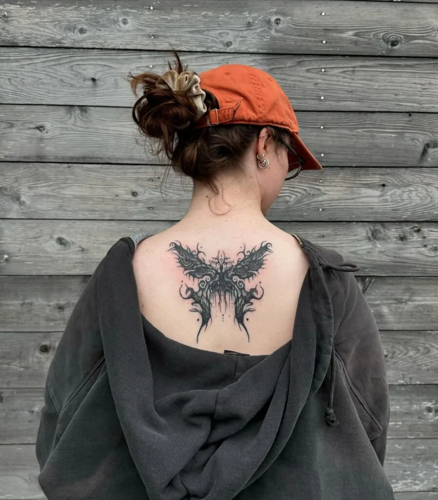 Gothic Butterfly Back Stick & Poke Tattoo