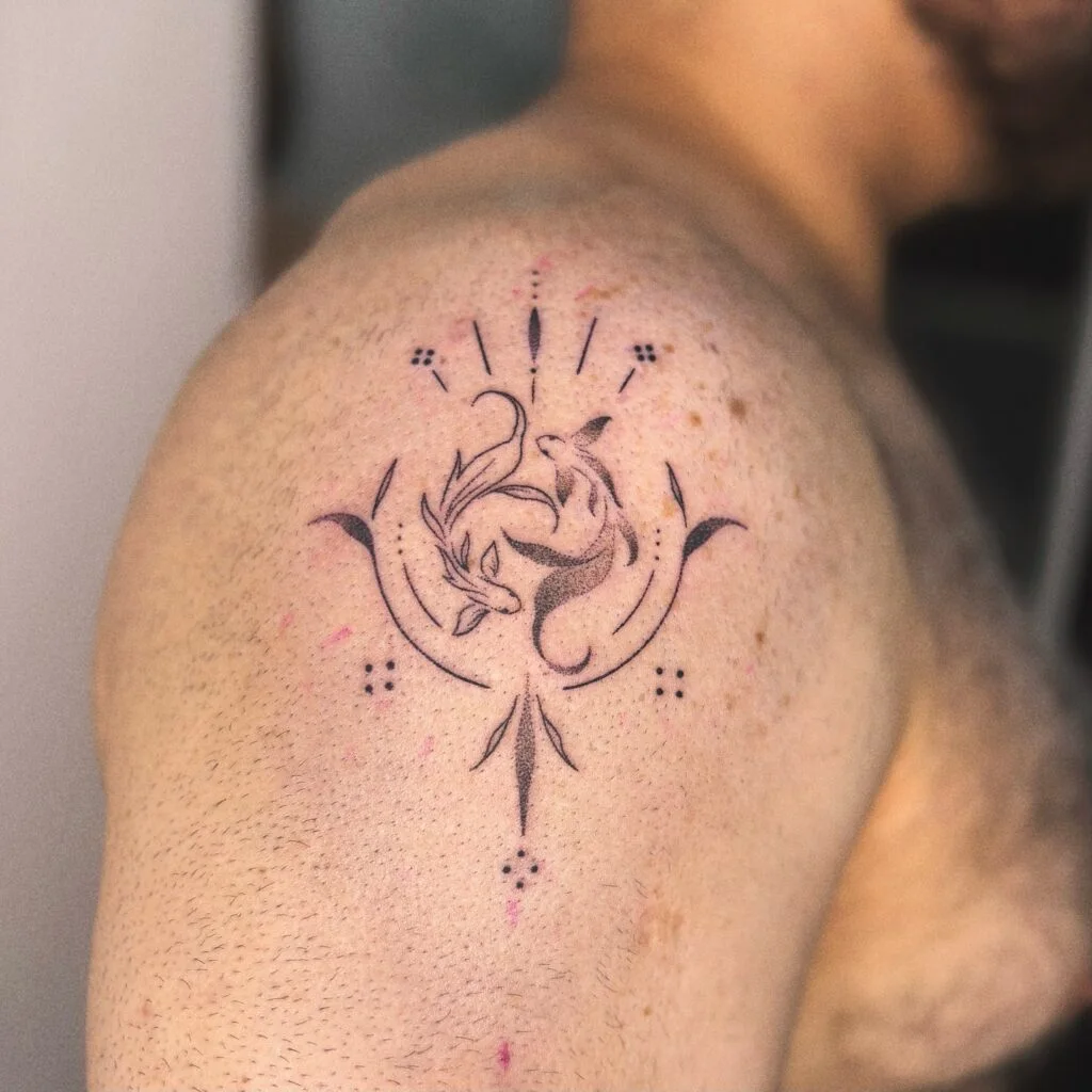 This elegant shoulder tattoo features two koi fish in a yin-yang formation, surrounded by a delicate frame of ornamental elements and fine dotwork. The koi, drawn in soft hand-poked lines, symbolize harmony, resilience, and duality.