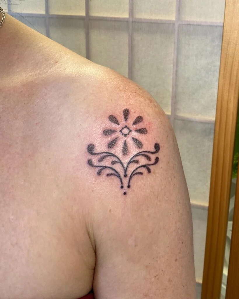These matching stick and poke tattoos are positioned on the shoulders and feature a symmetrical, mandala-inspired floral design. The upper portion resembles an open flower with soft, radiating petal shapes, while the lower half showcases curved ornamental lines and dotted accents, adding structure and elegance.