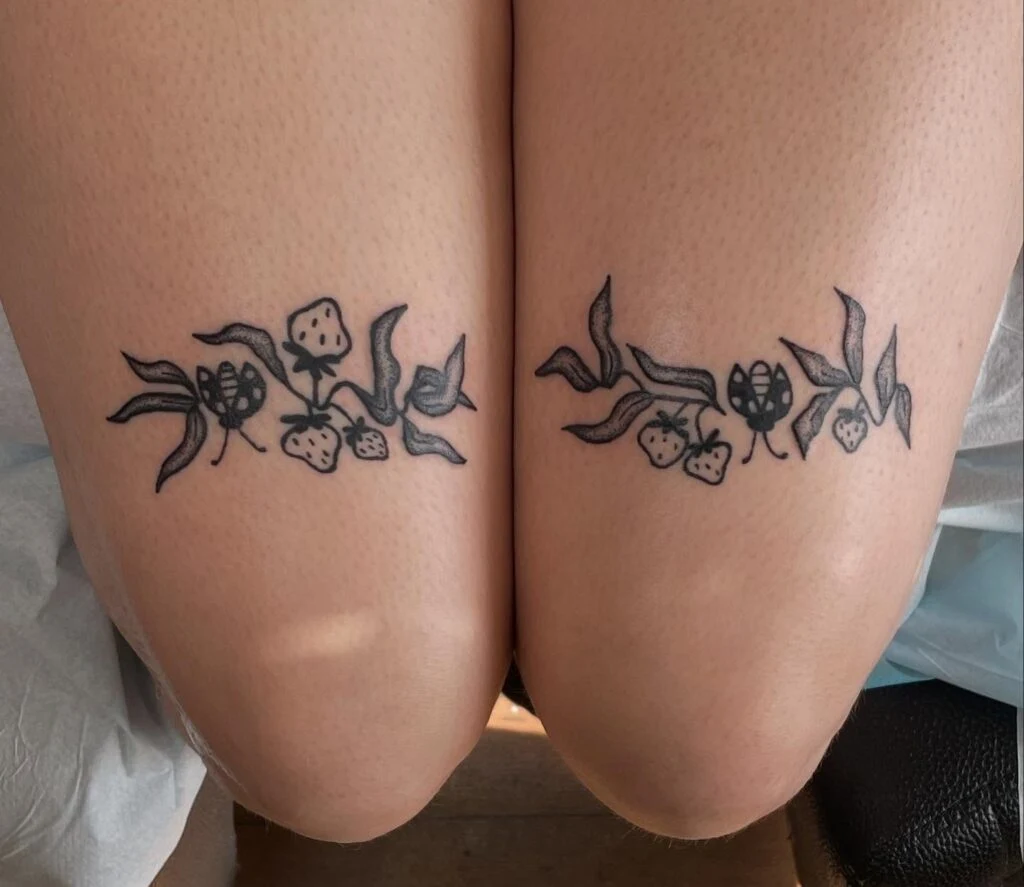 These playful stick and poke tattoos feature symmetrical botanical designs on each knee, centered around strawberries, leaves, and small bugs. The strawberries are rendered in a bold, hand-drawn style, while the bugs add a quirky, unexpected twist.