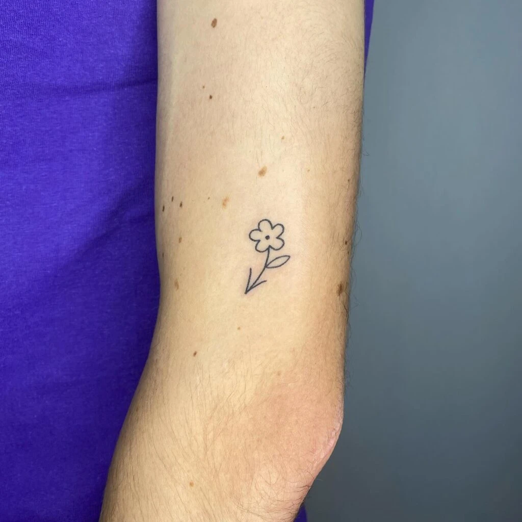 This charming stick and poke tattoo features a simple, hand-drawn flower with a single leaf and an angled stem. Its minimal design captures a playful, childlike quality—almost like a sketch from a notebook brought to life on skin.