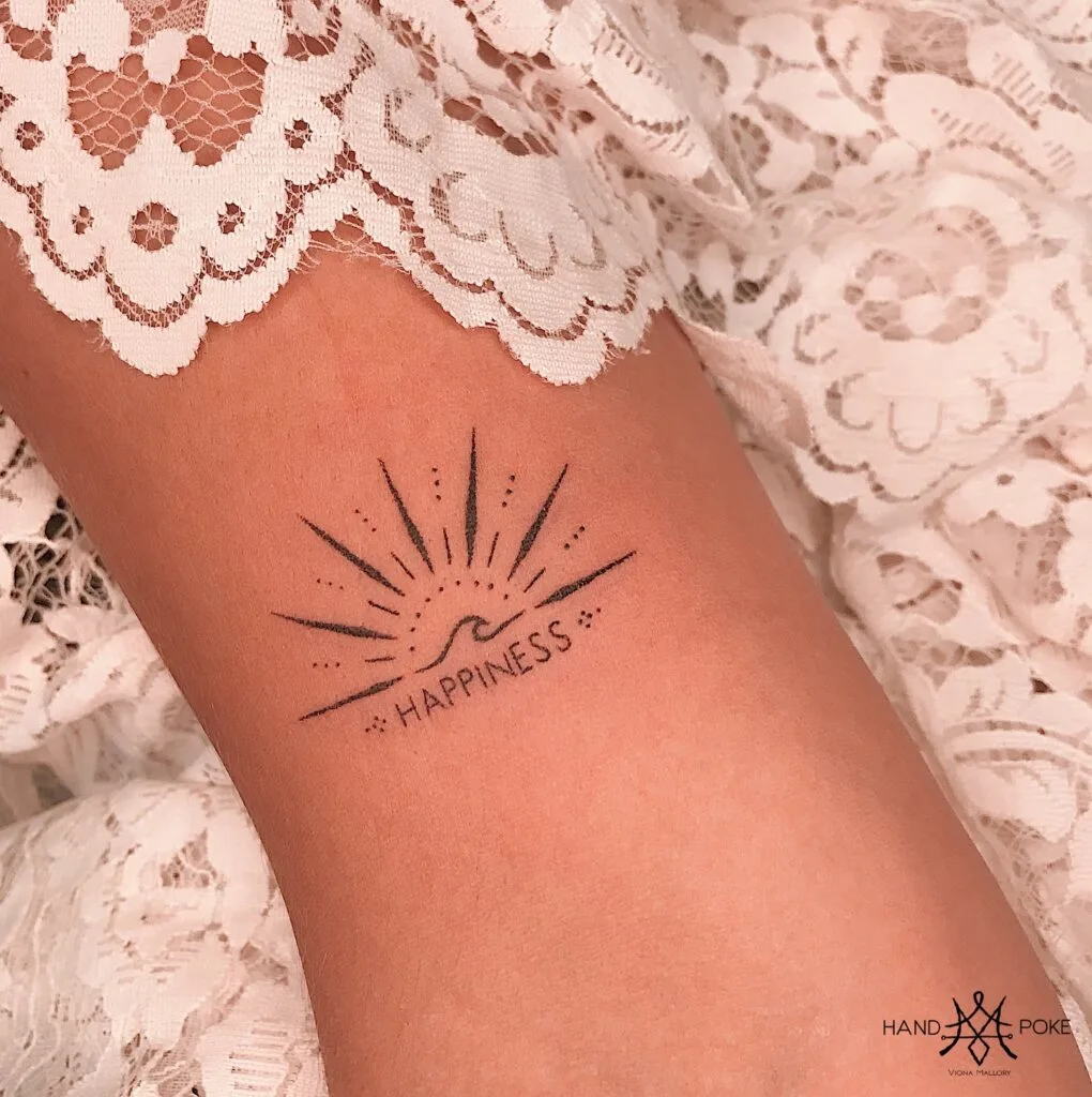 This delicate stick and poke tattoo radiates warmth and joy with its simple sunrise design above a small wave and the word HAPPINESS written beneath. Thin, hand-poked lines form sun rays stretching outward, paired with dotted accents that enhance its gentle energy.