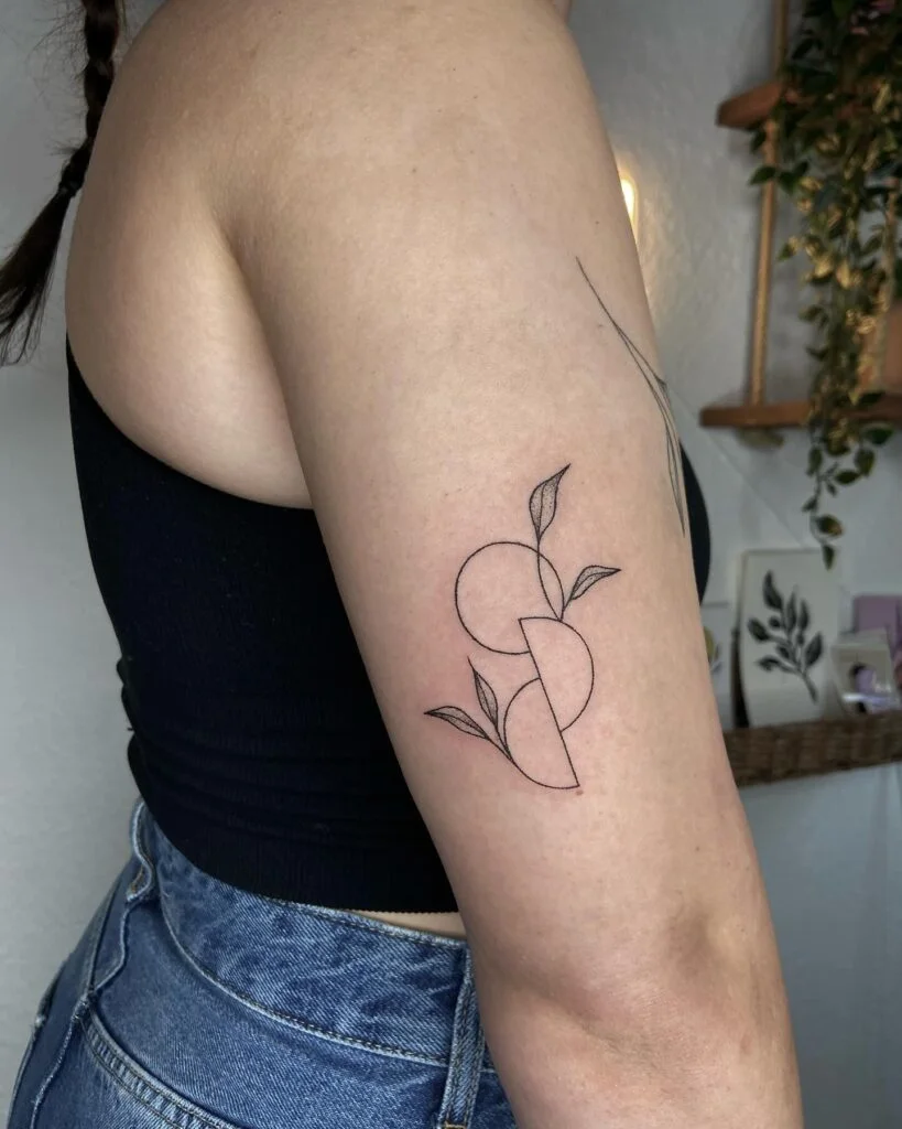 This elegant stick and poke tattoo features a refined composition of intersecting geometric shapes and delicate botanical elements. Two overlapping circles are split by a clean diagonal line, creating a visual rhythm that’s both modern and organic.