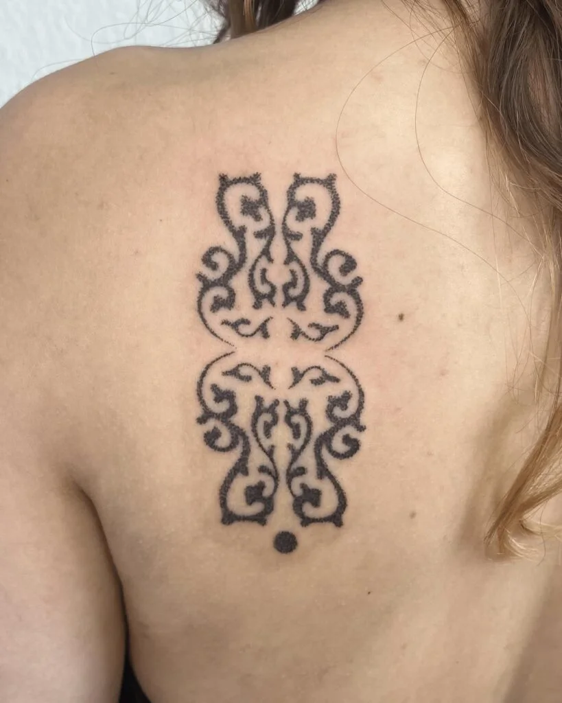 With scrolling patterns and flourishes, it channels a decorative, almost filigree-like aesthetic. The small solid dot at the base anchors the piece visually. This tattoo is ideal for someone drawn to symmetrical art and timeless ornamental styles, blending elegance with a bold presence on the upper back.