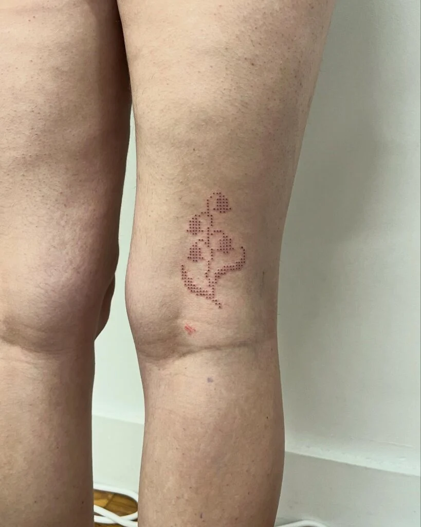 This creative stick and poke tattoo features a pixel-style floral design inked in red, located just below the knee. Each dot is carefully placed to form the outline of a stem with heart-shaped leaves or blossoms, giving the tattoo a digital or stitched appearance.
