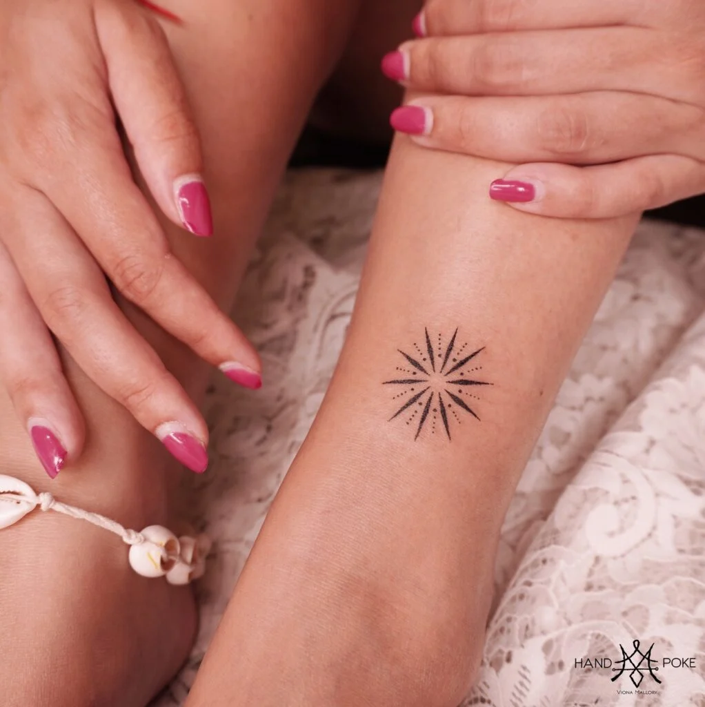 The hand-poked style brings a delicate, handcrafted charm to the otherwise geometric form. Symbolizing light, energy, and direction, this tattoo serves as a small yet powerful reminder of inner strength and clarity. It’s perfect for those drawn to celestial motifs and meaningful minimalist designs.